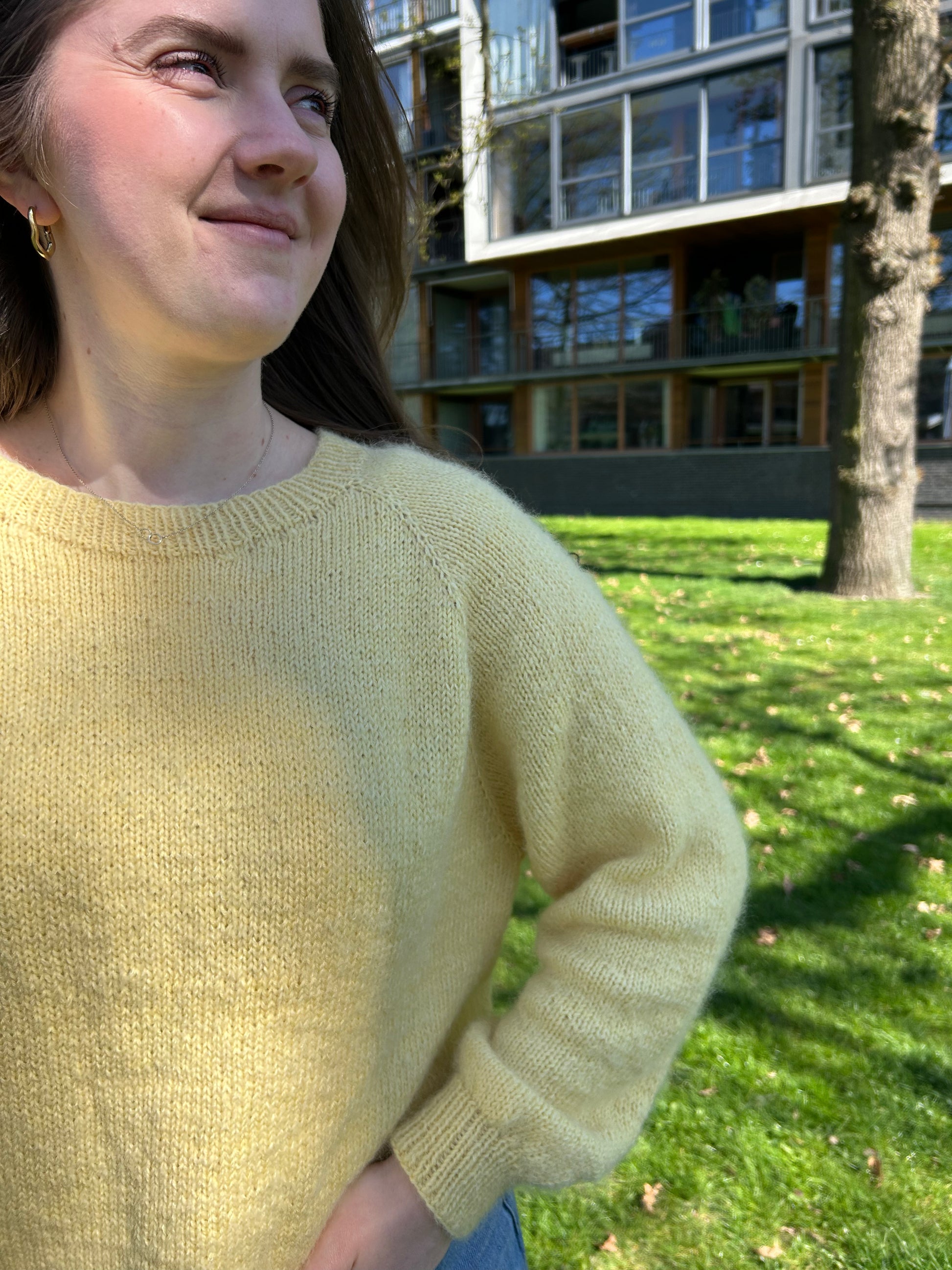 The sample in the pictures is the No frills sweater by Petiteknit and is made with 3 skeins of Flowy Fingering and 3 skeins of Soothing Suri to create a size three. It's honeslty my absolute favorite sweater right now and I've already worn it tons.