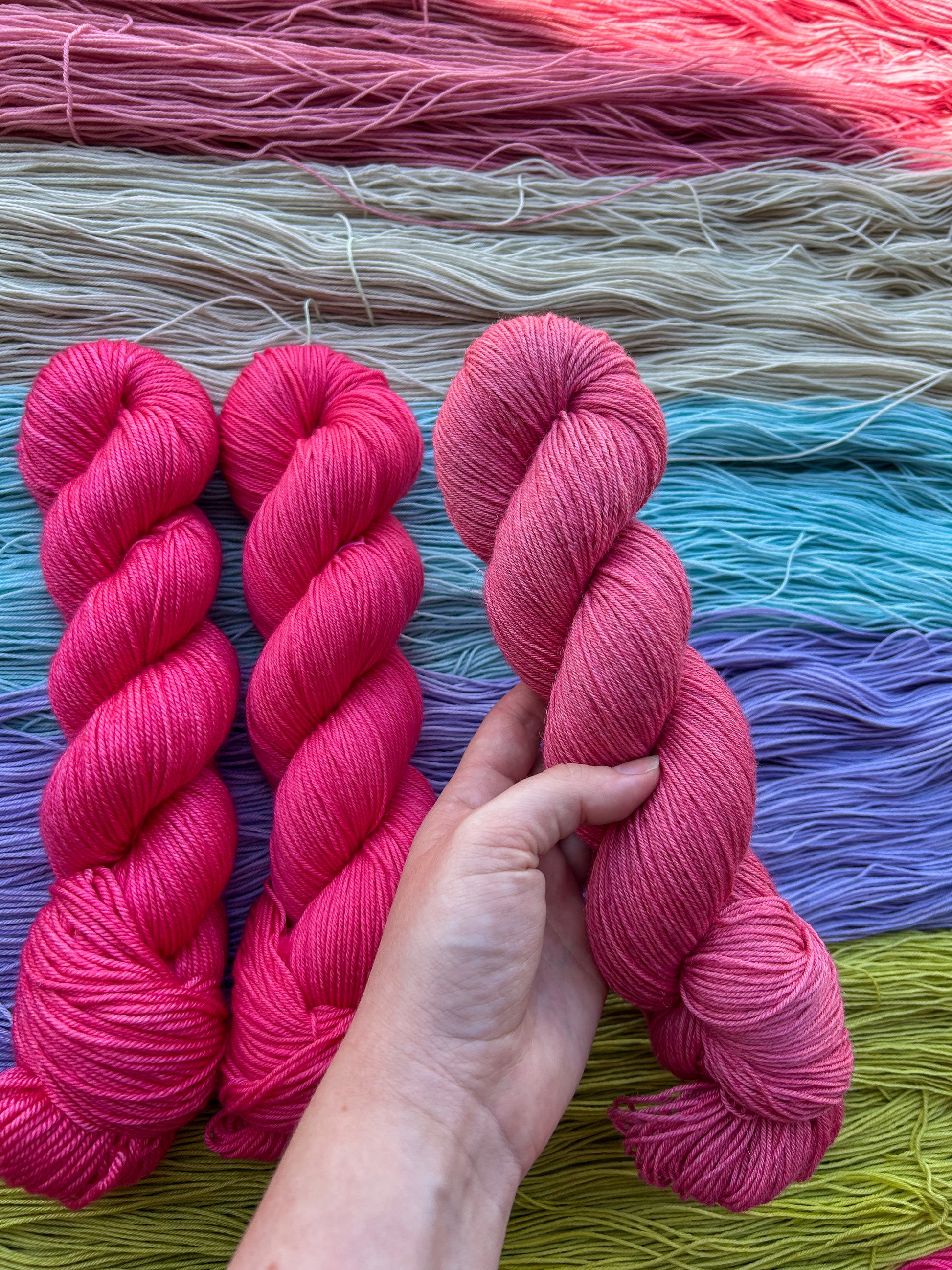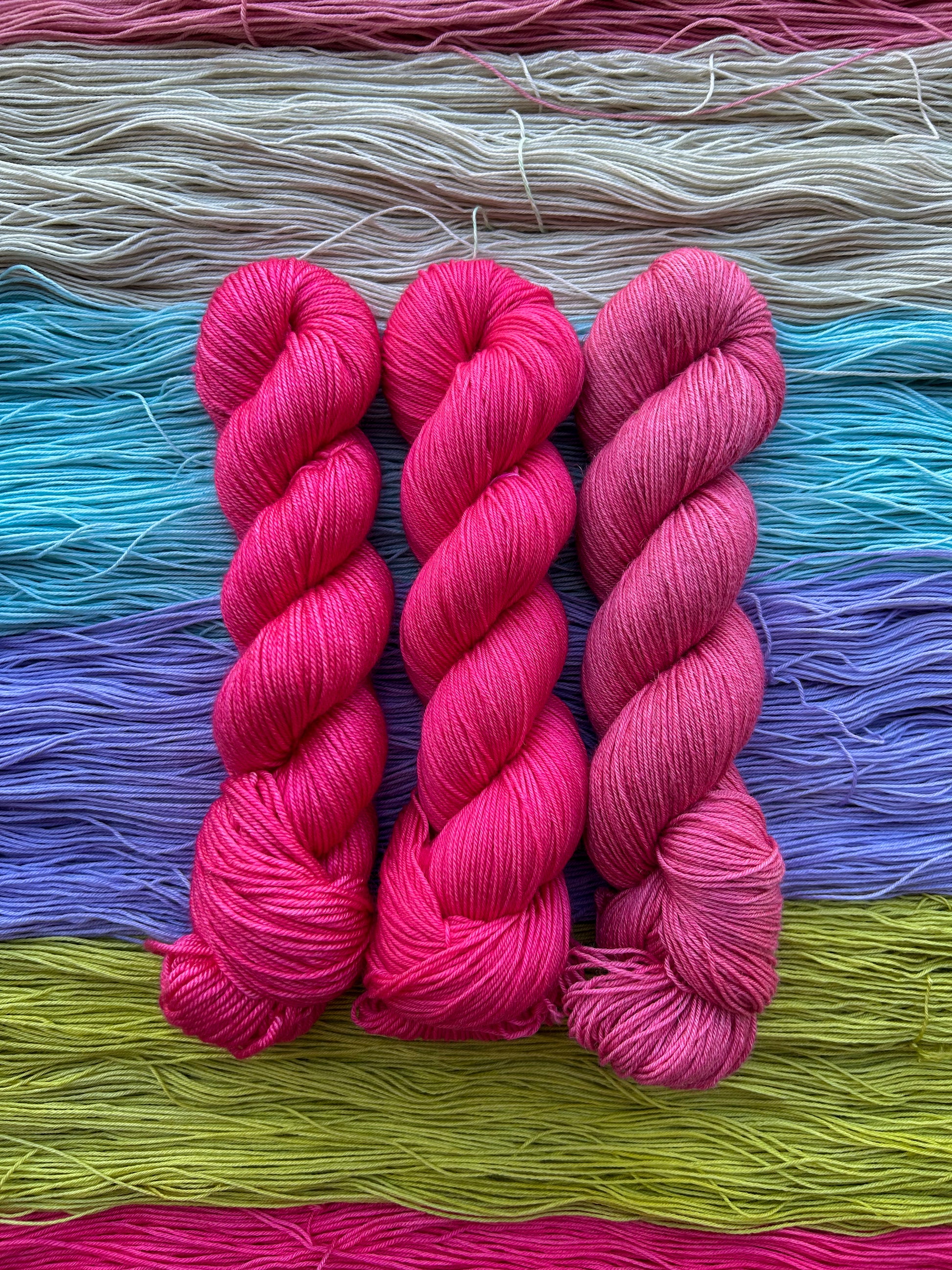 Hot Girl Summer is here to turn heads. A saturated, electric pink that captures all the energy of warm nights, juicy drinks, and dancing barefoot on the grass. Itโs fun, loud, and a little rebellious, just like your favorite summer version of yourself. Whether you're adding a pop to your colorwork or going all in on a bold pink garment, this shade holds its own.