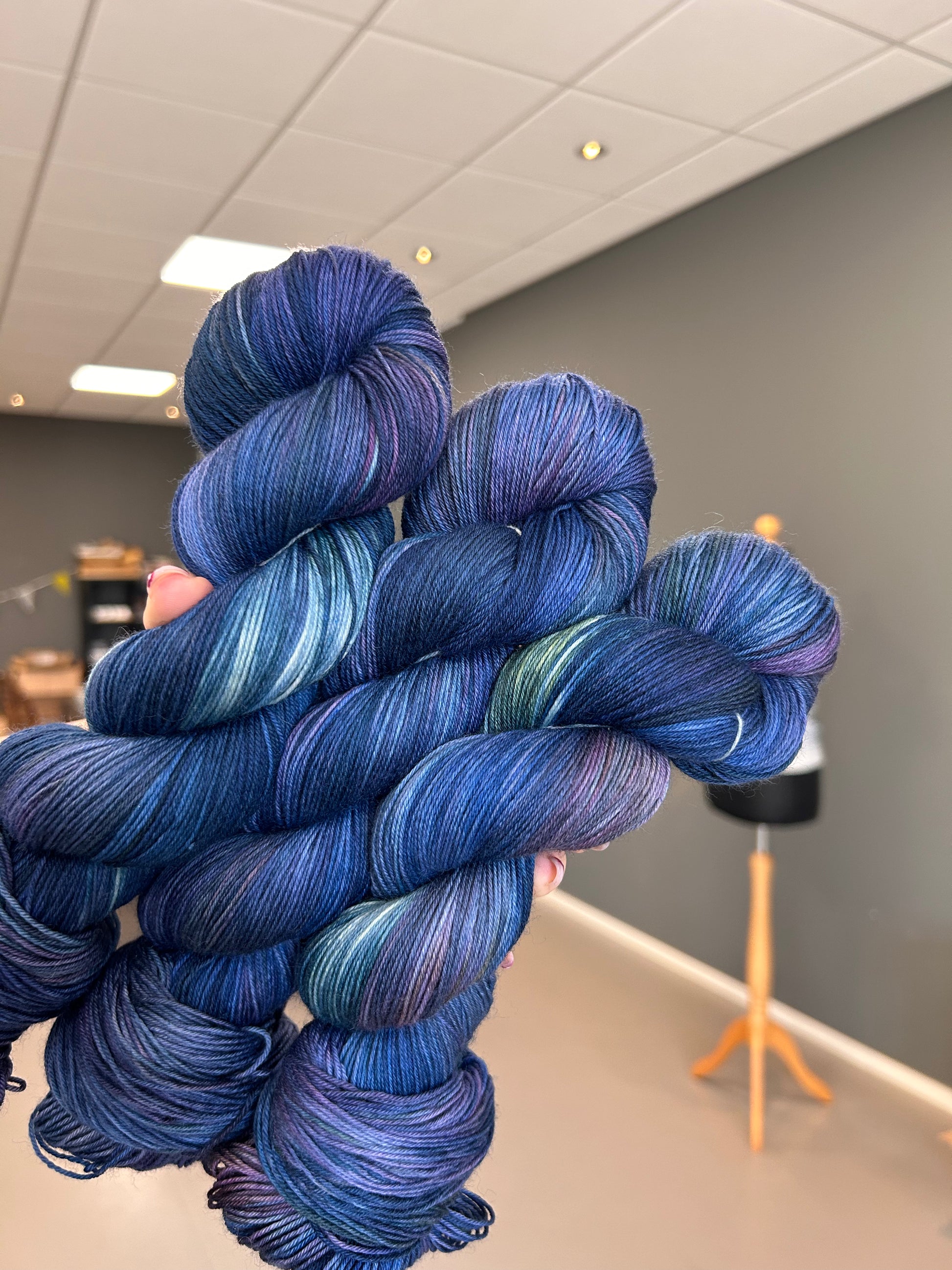 This color is created during one of the yarn dyeing workshop with the leftover dyes from that workshop. These skeins are therefor extra unique. It's a lovely blend of blue with hints of greens, purple and everything in between.