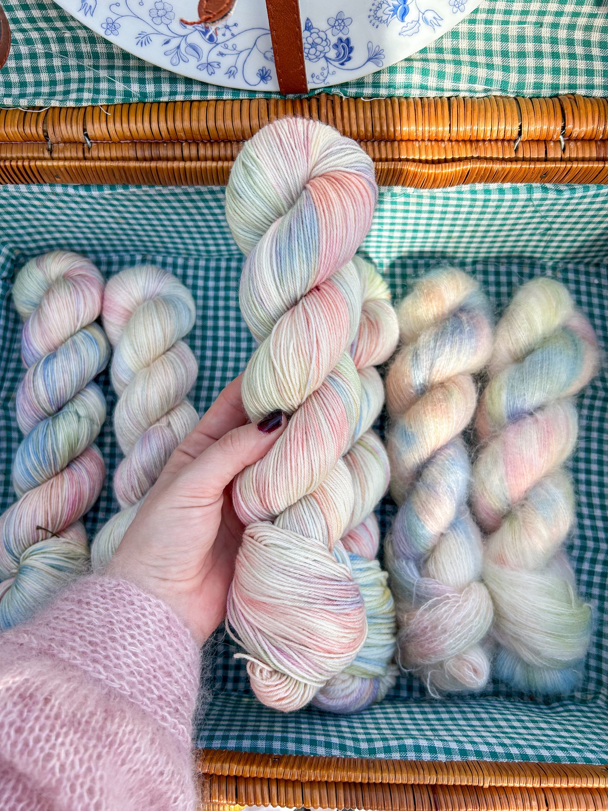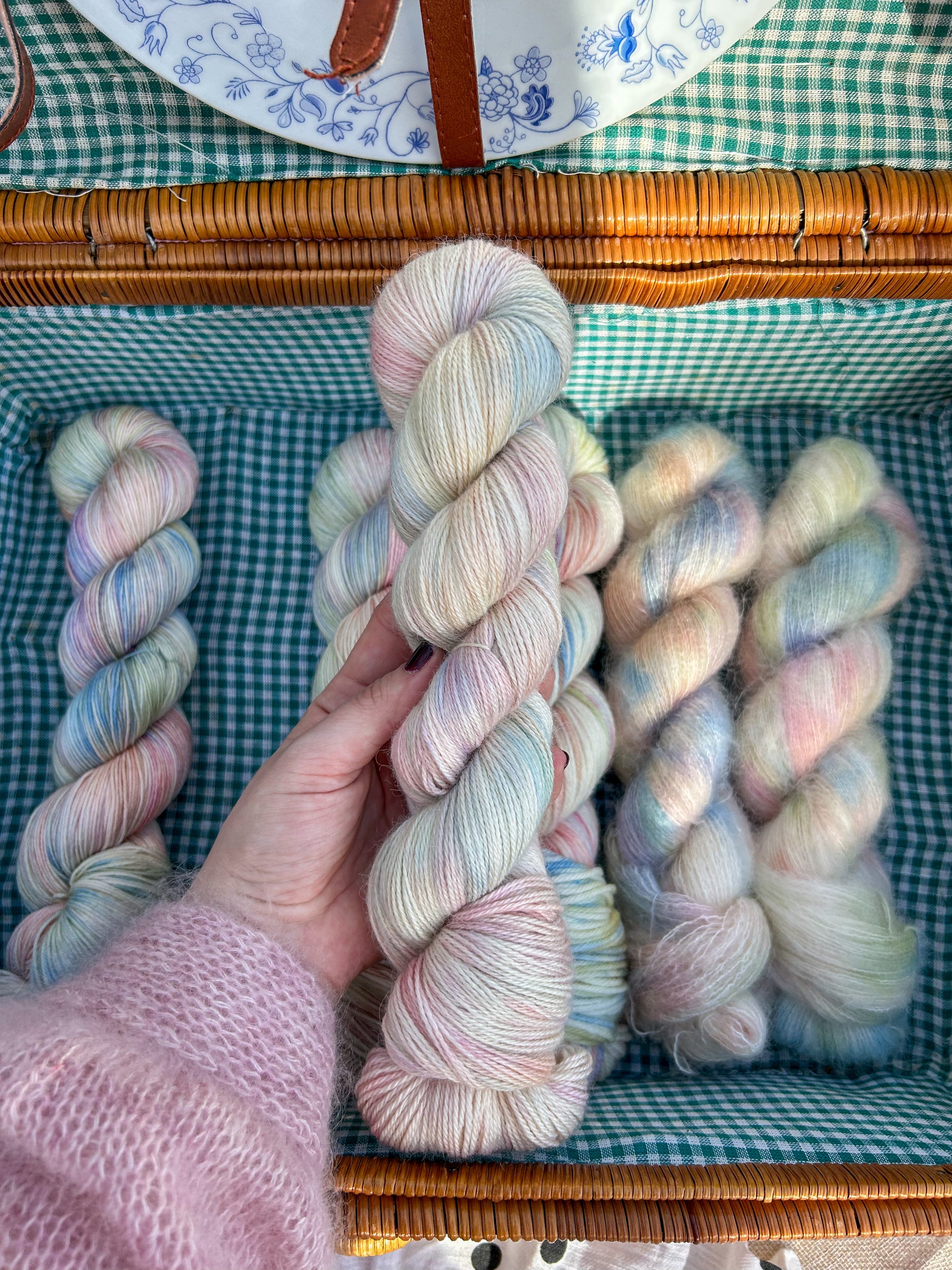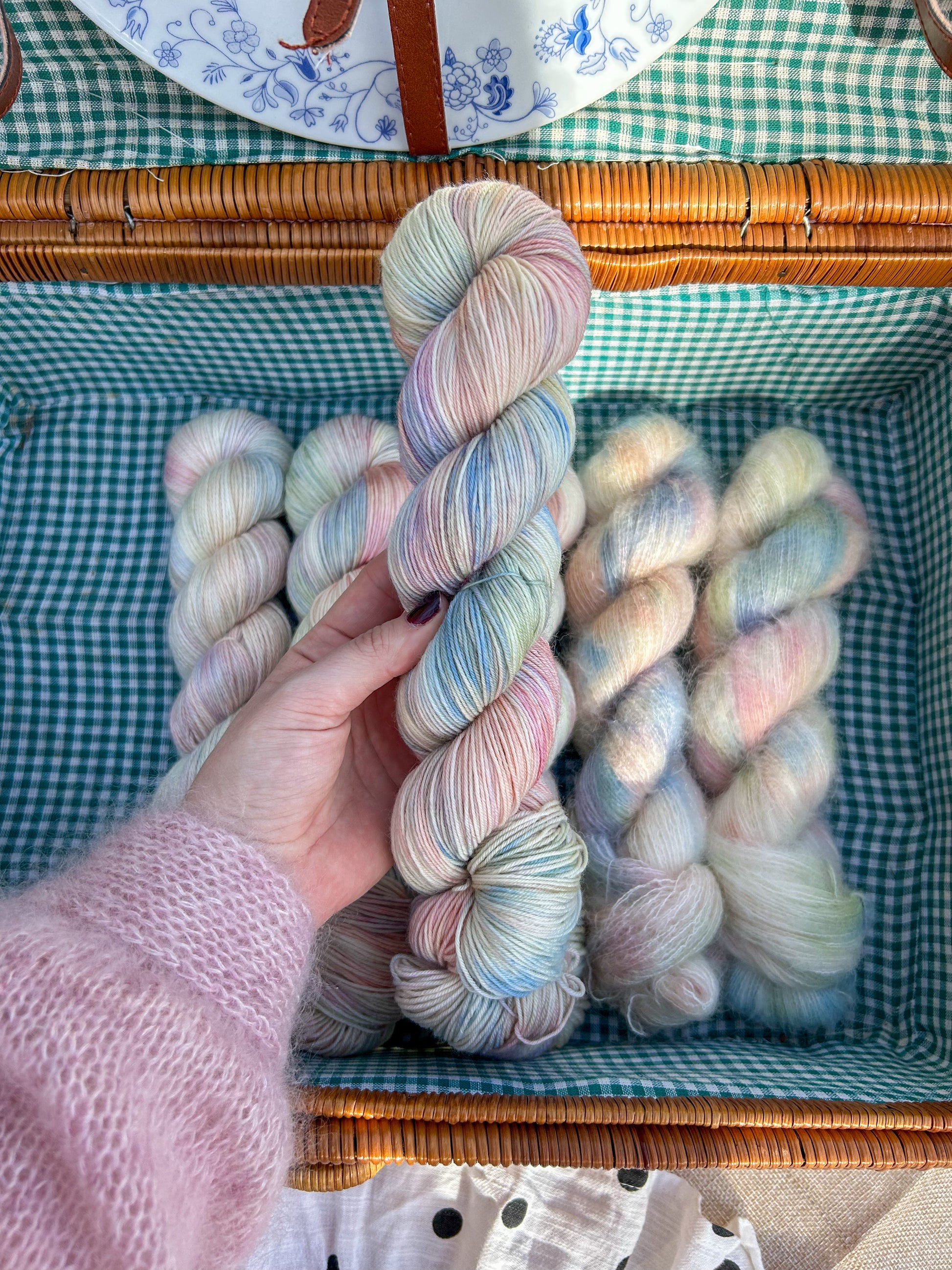 I wanted Patchwork to feel like the perfect mix of a cozy picnic, laughing with friends, sunshine on your face, and a picnic basket full of your favorite treats. The color is dyed in a way that every stitch will bring something new, making them blend all together โจ