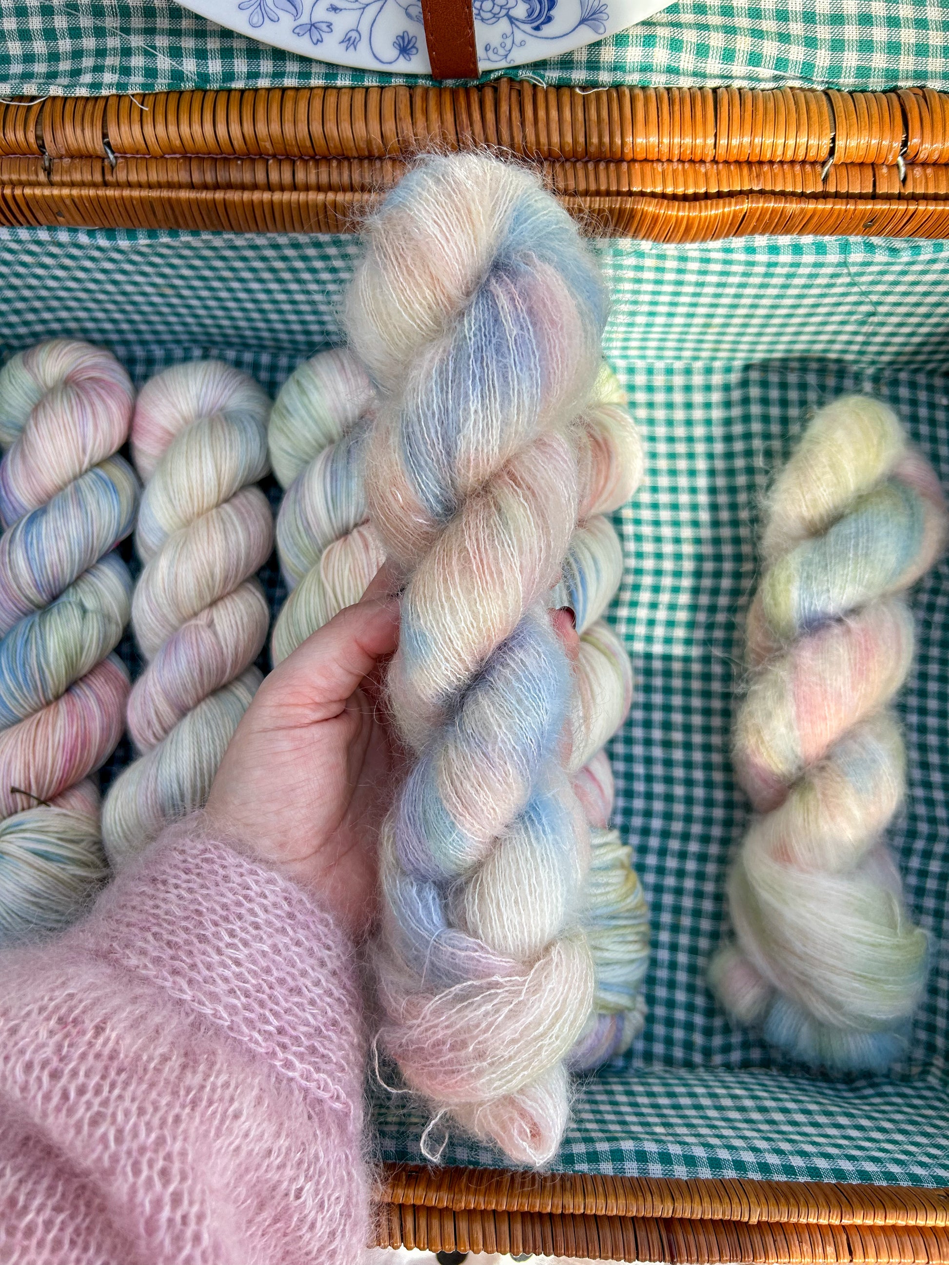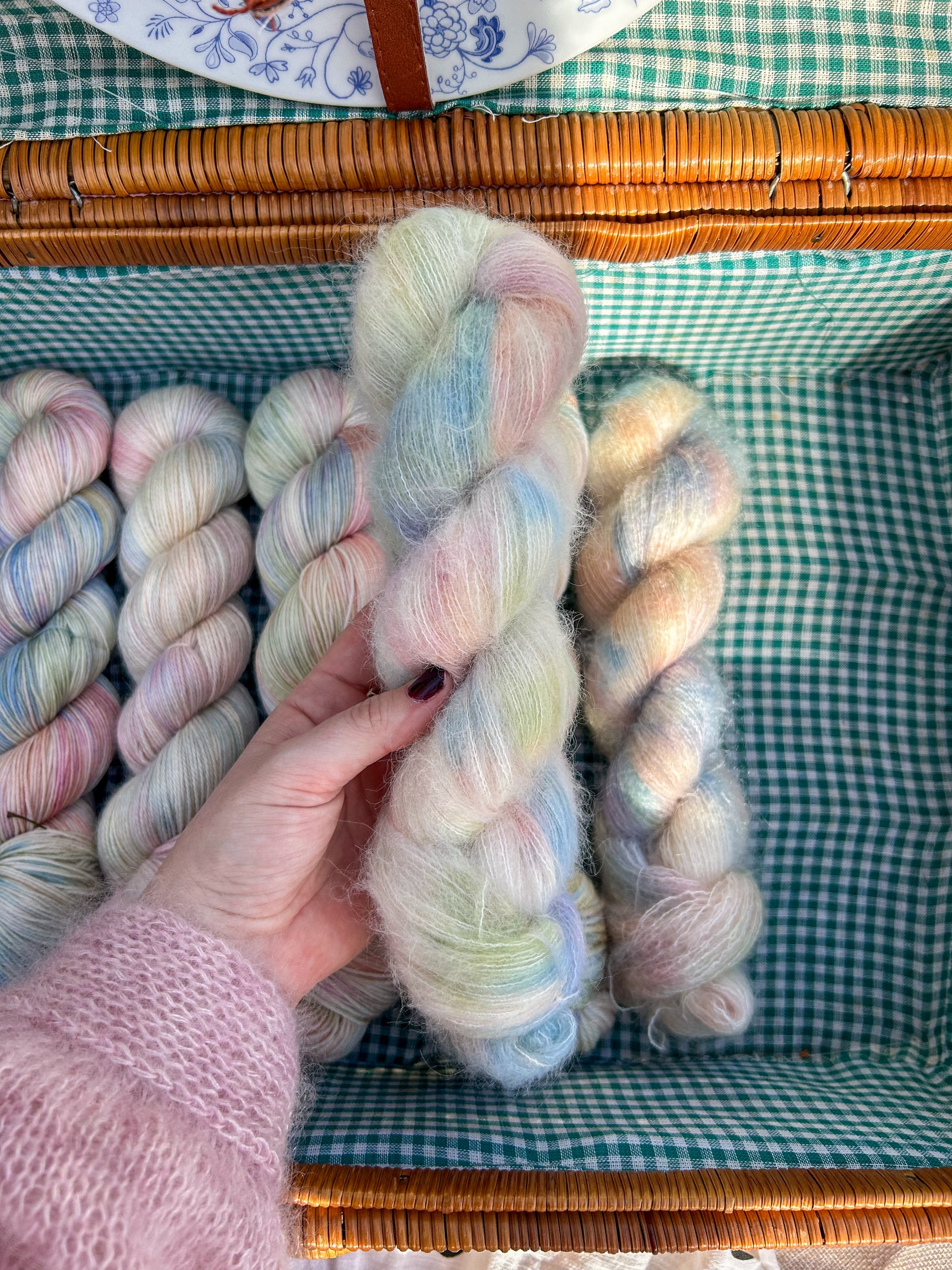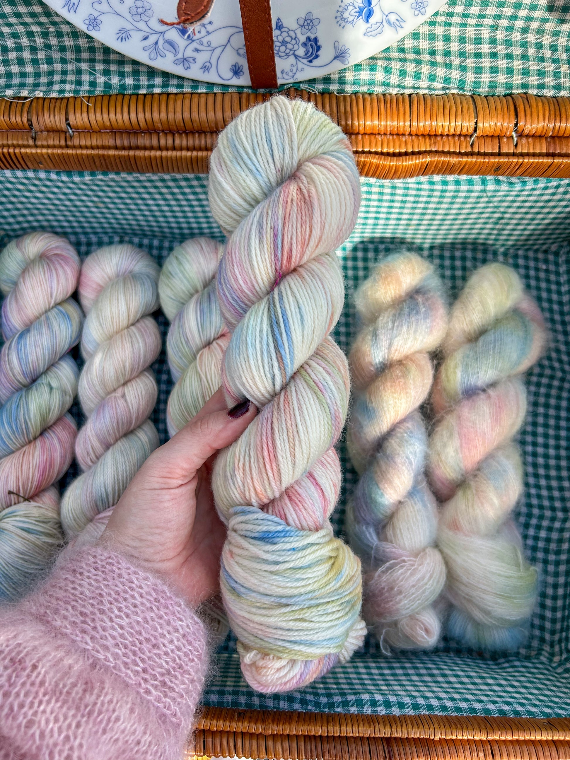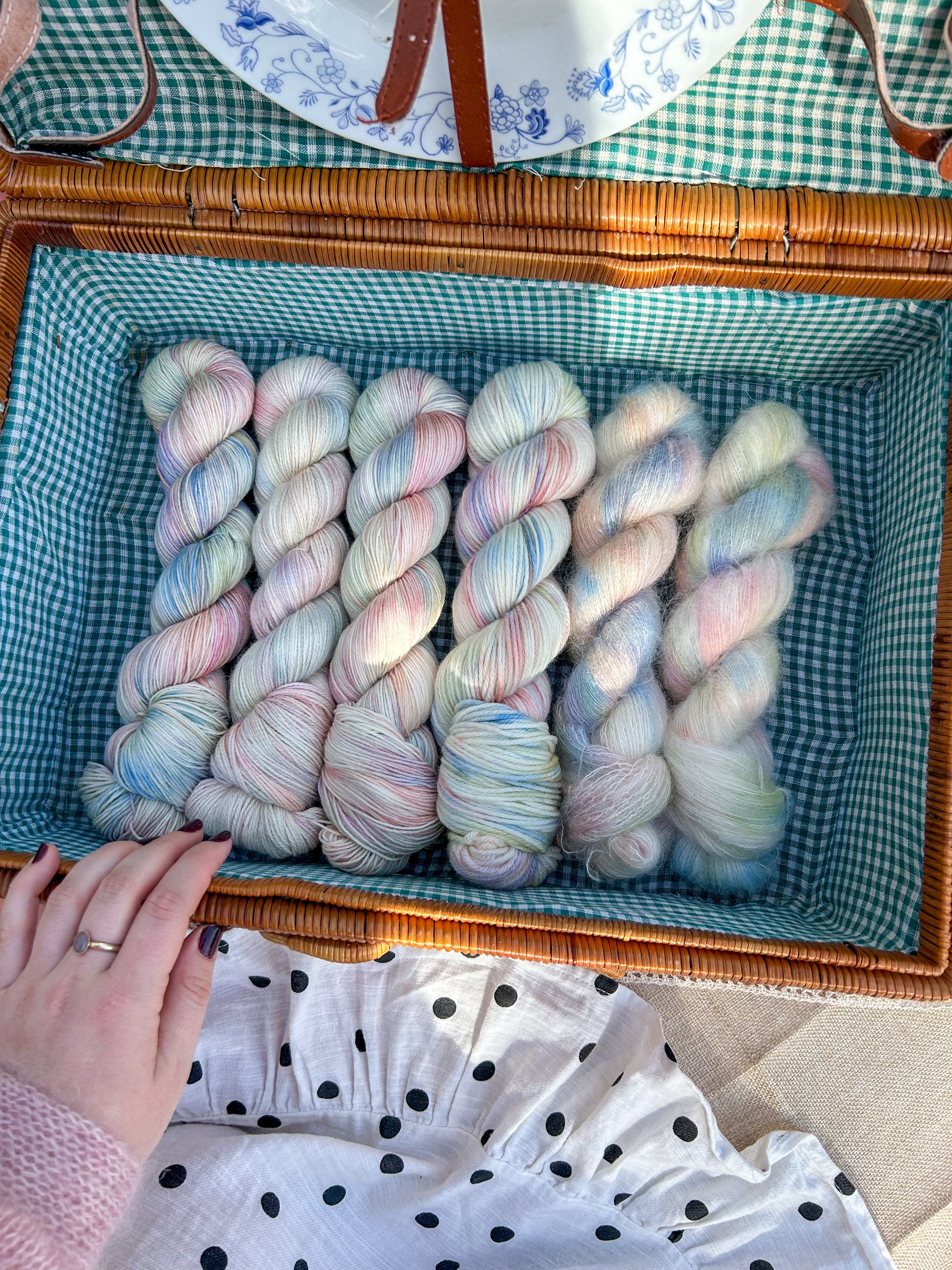 I wanted Patchwork to feel like the perfect mix of a cozy picnic, laughing with friends, sunshine on your face, and a picnic basket full of your favorite treats. The color is dyed in a way that every stitch will bring something new, making them blend all together โจ