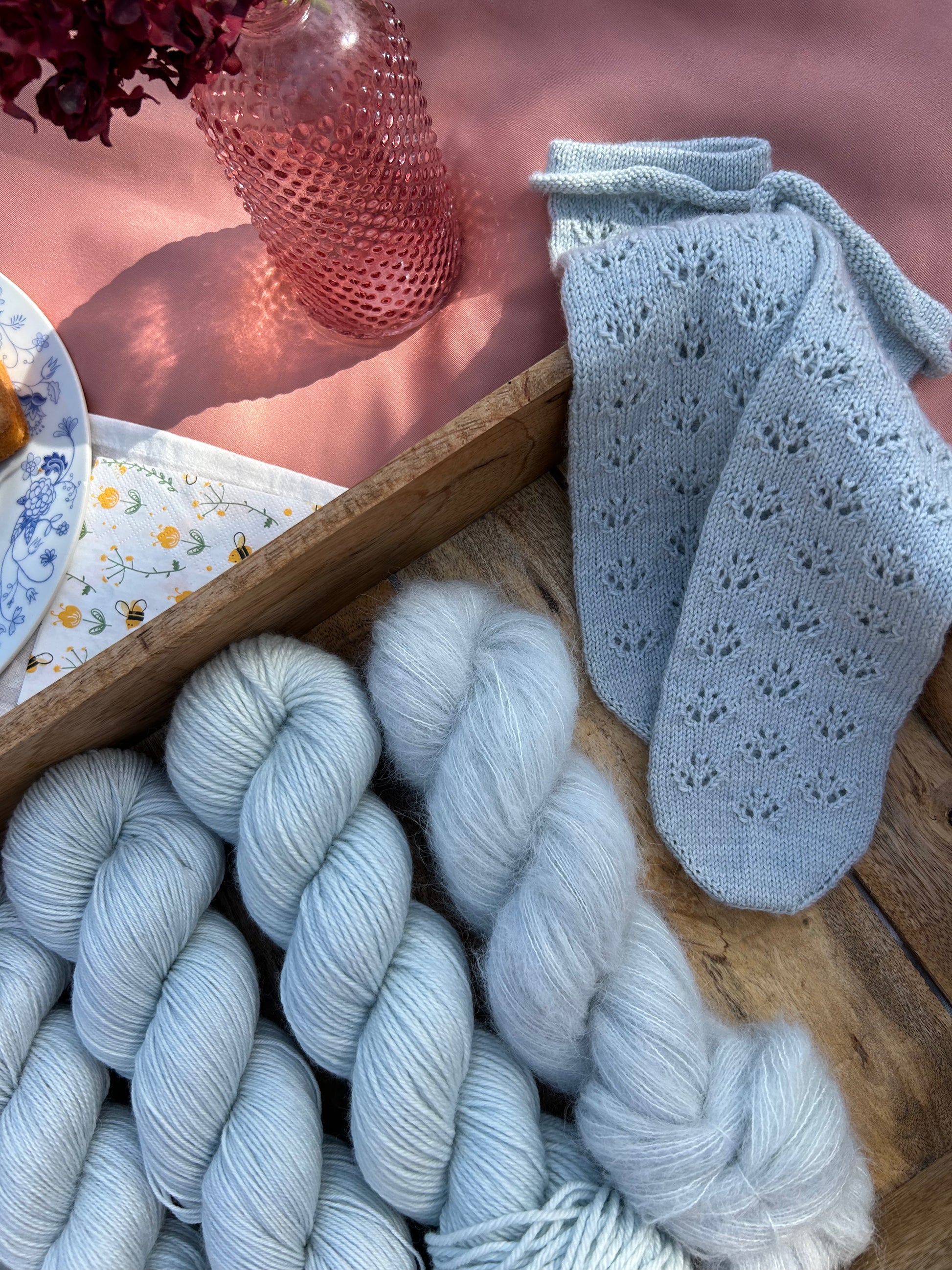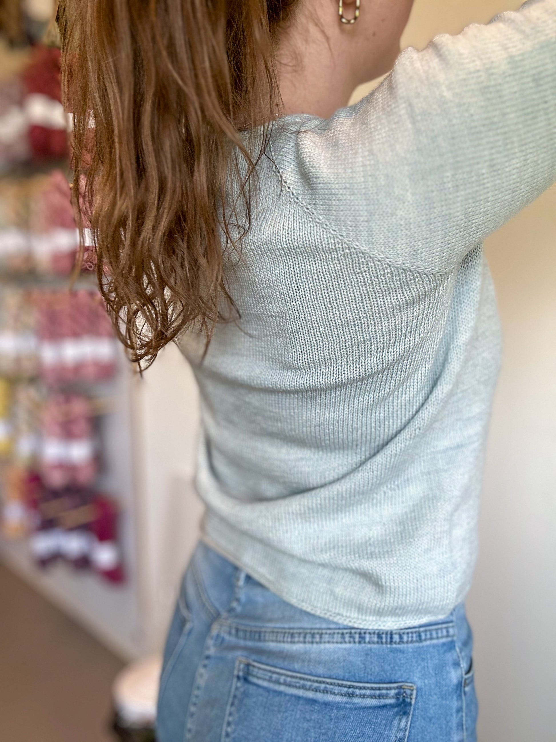 The sample in the pictures is the cumulus tee by Petiteknit. For a size three, three skeins of sky in Soulful sock were used. There were a good amount of leftovers of the third skeins so a whole pair of lace socks were made from that.
