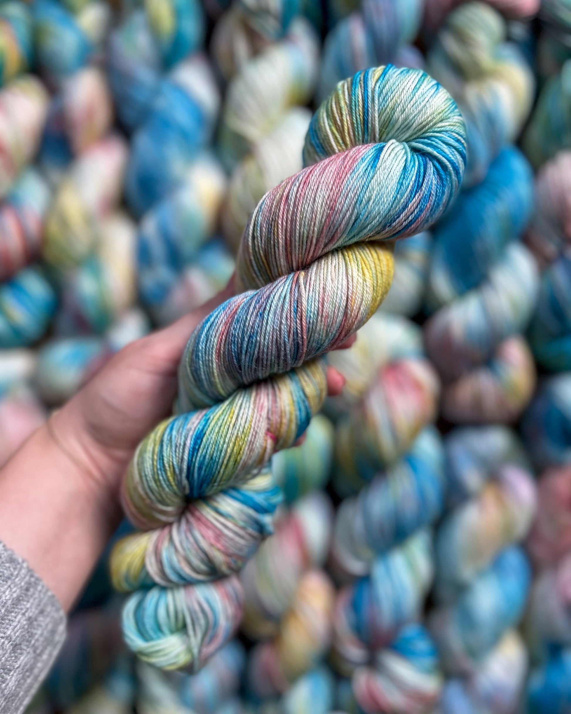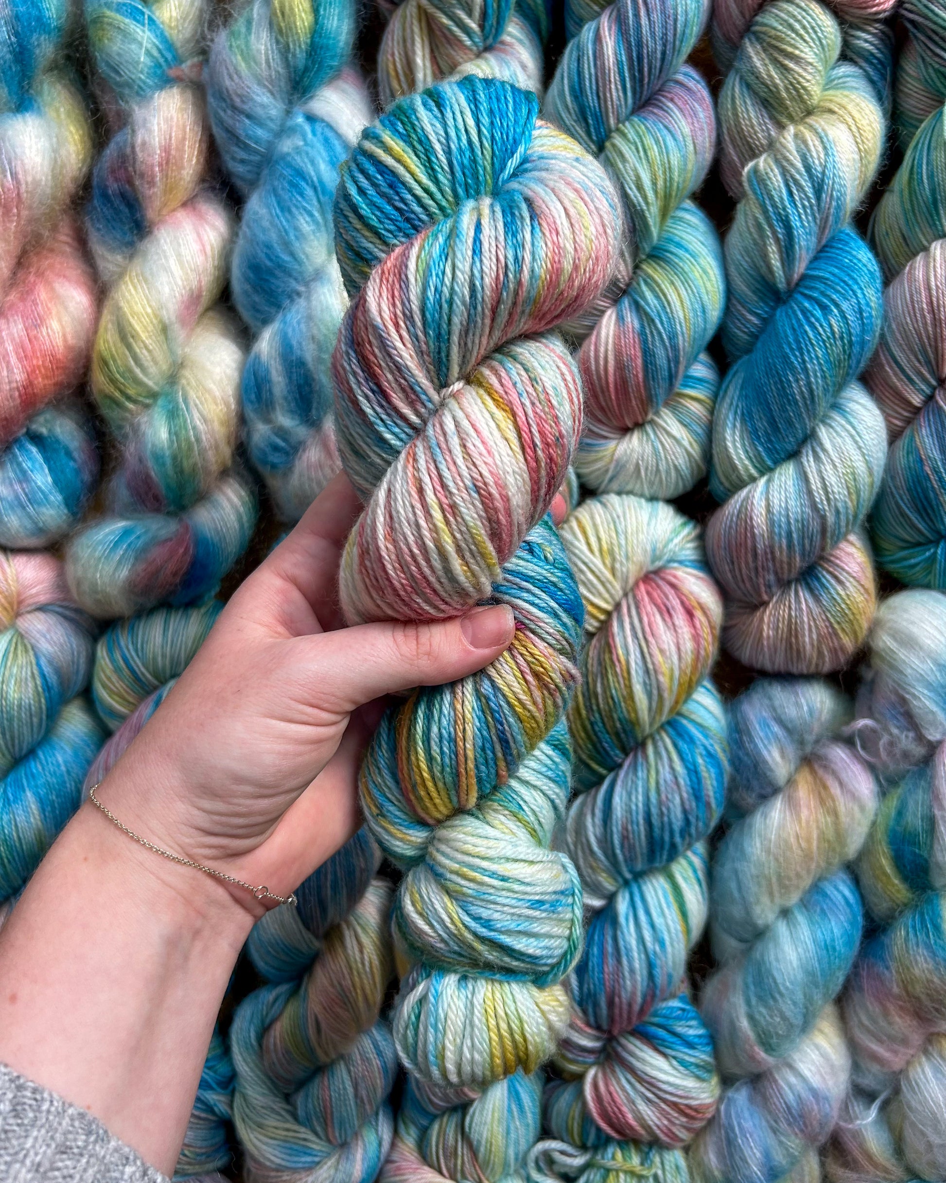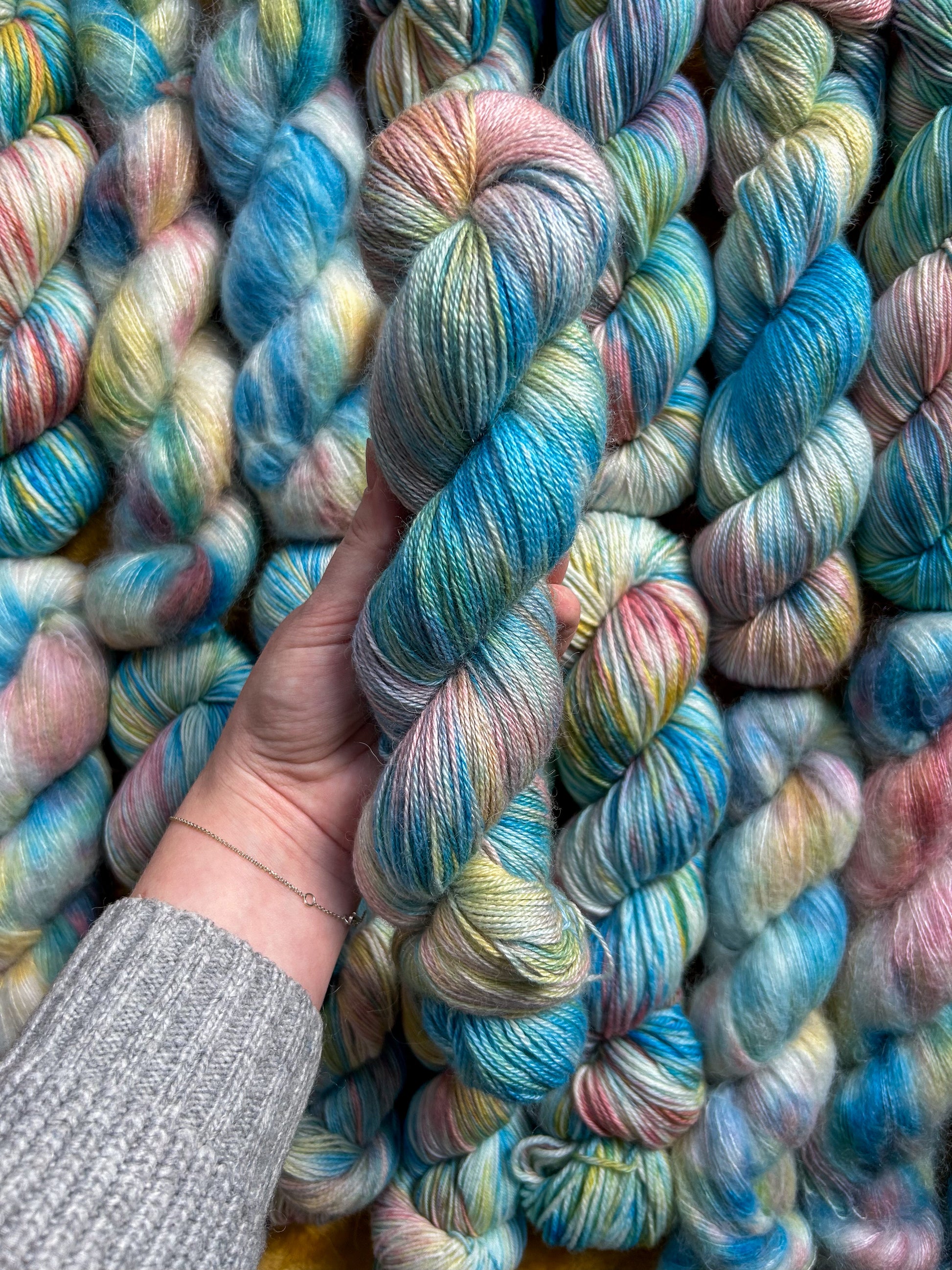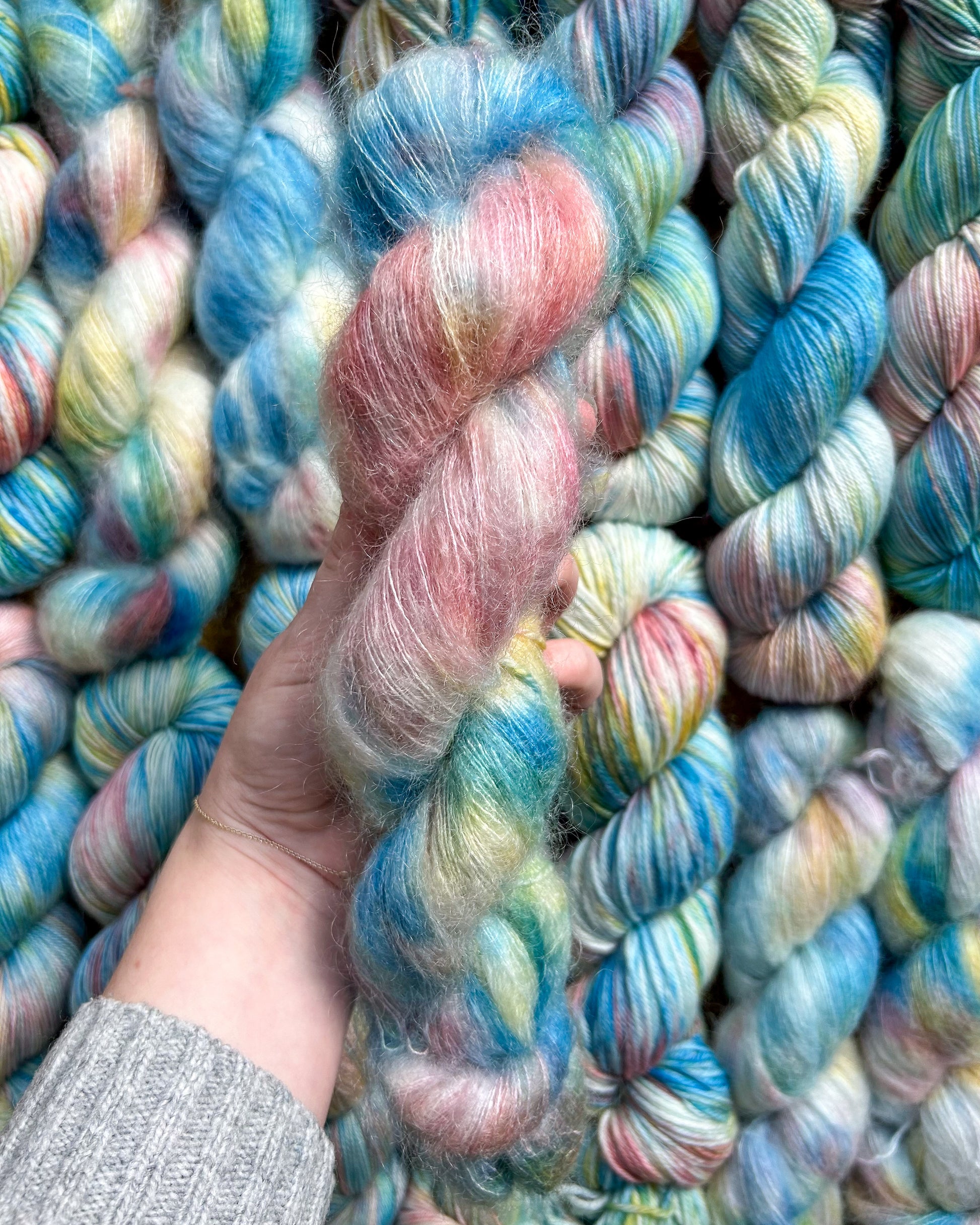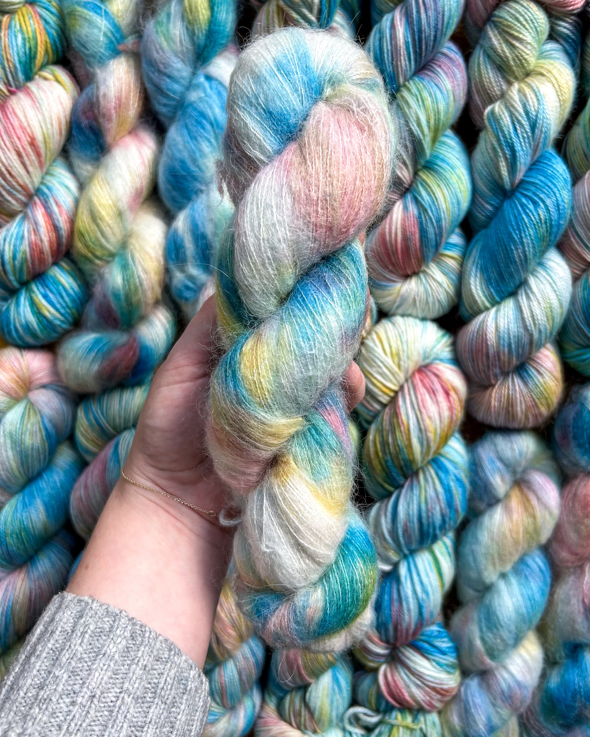 🧶All with all such a fun color and it marls beautifully with a white mohair or a tie dye guy fluff with a white base yarn! You will see it in the swatches 👀