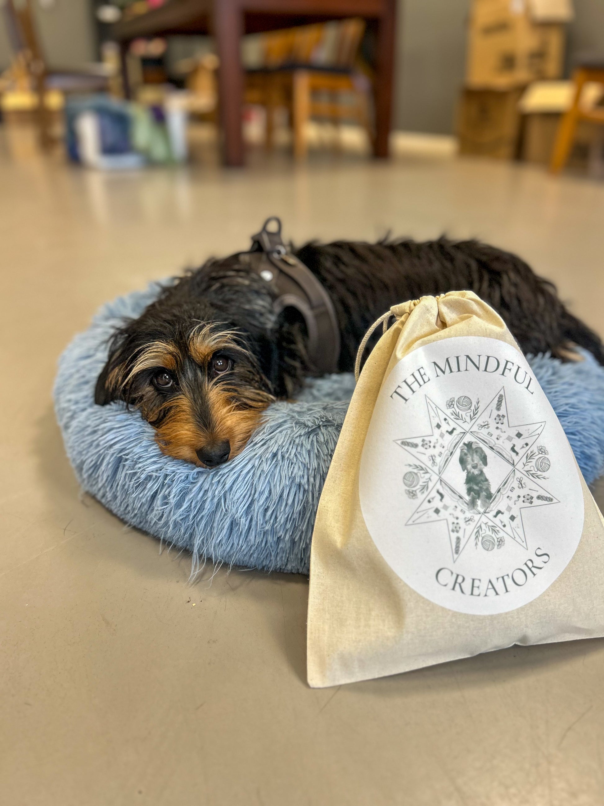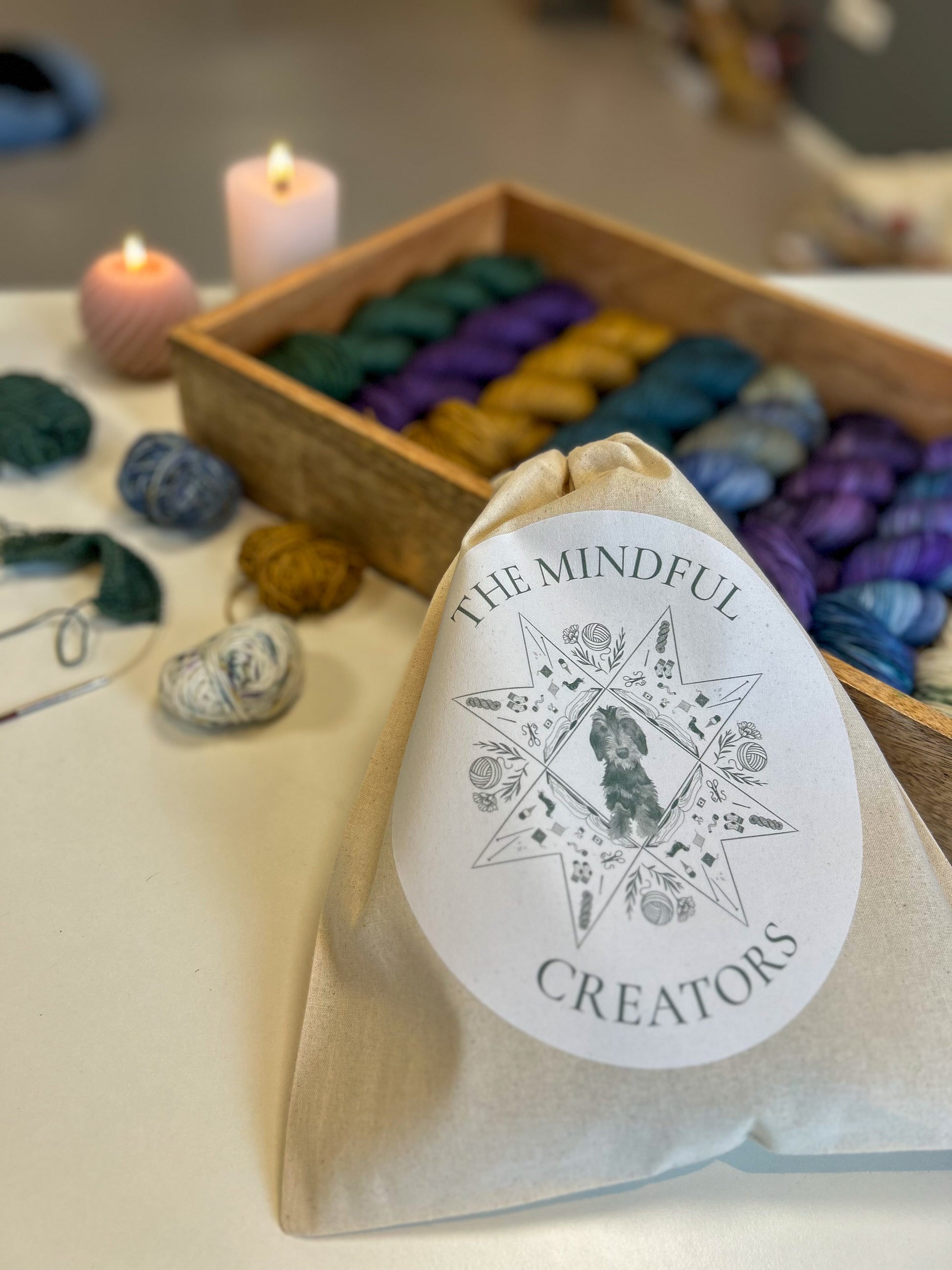 Every little detail tells a piece of The Mindful Creators story, from the yarn and swatches, to the ice cream and tea, to ,of course, my little studio assistant Guusje right in the center 🐶