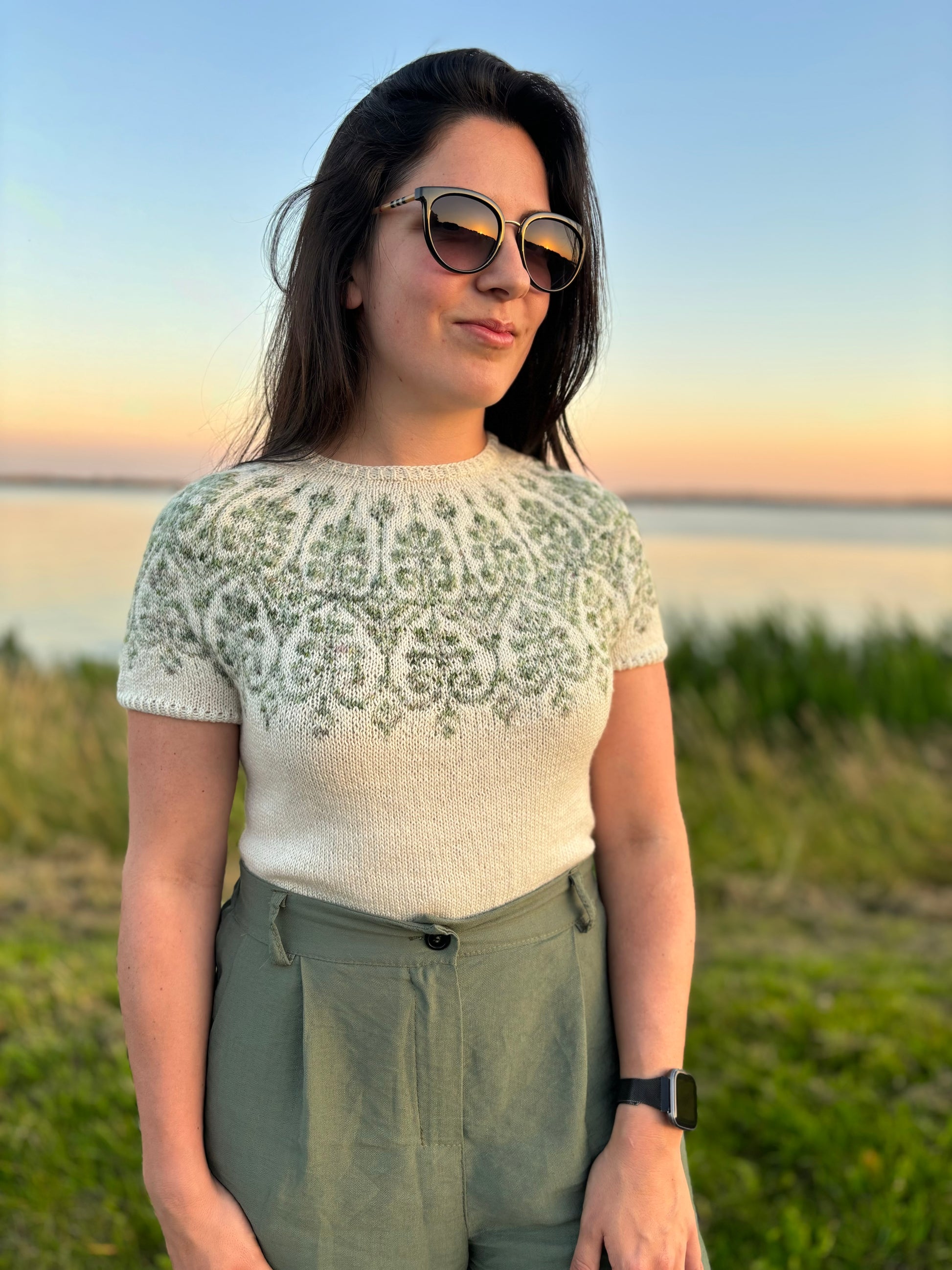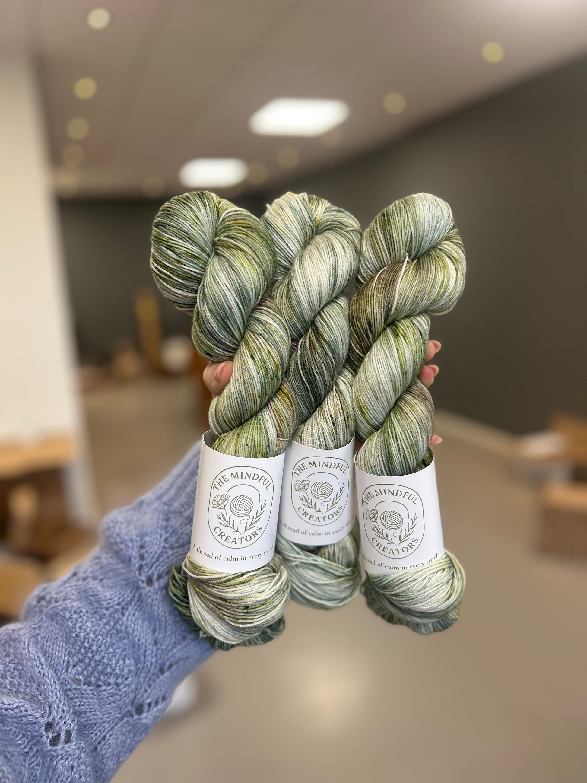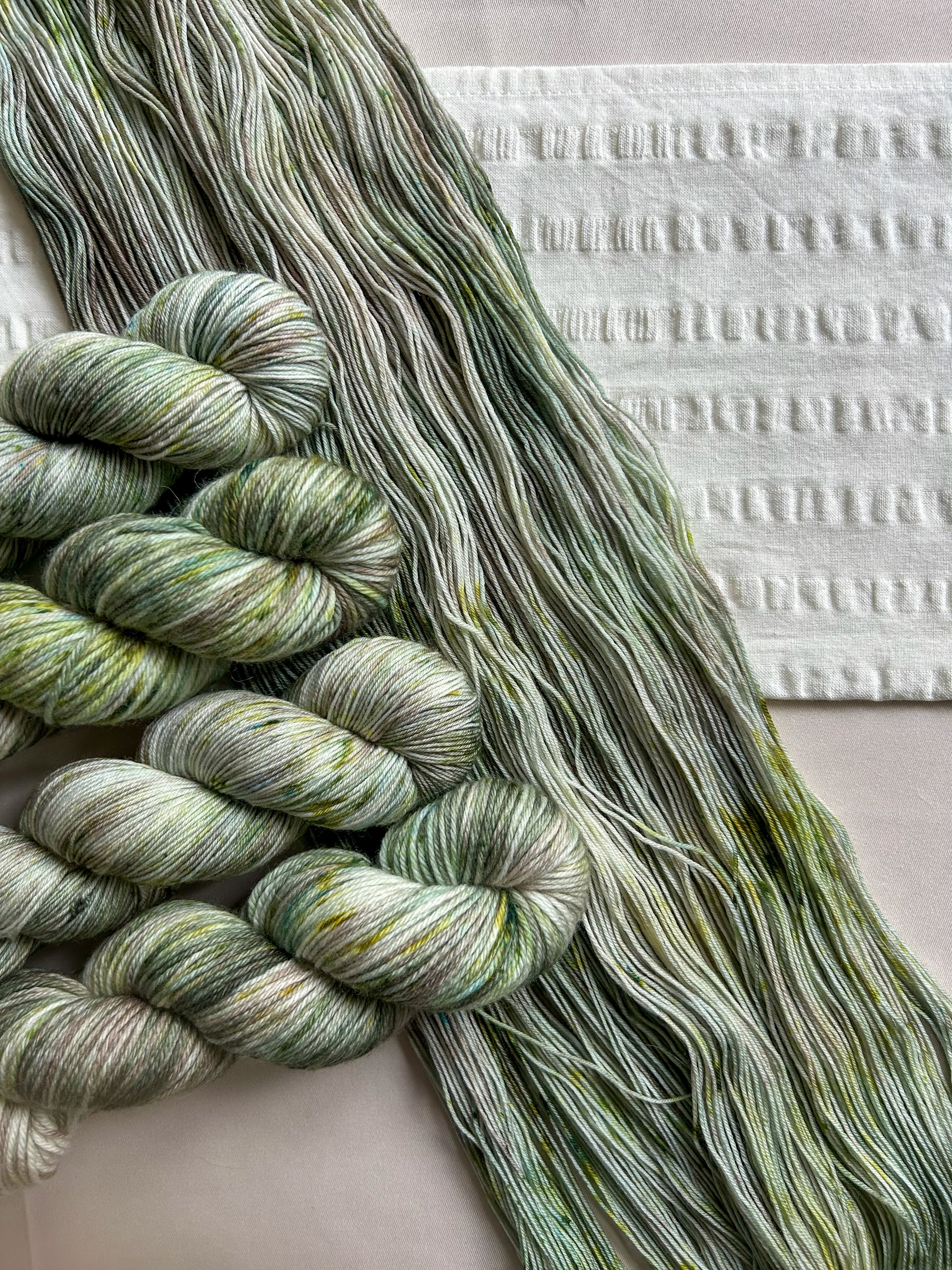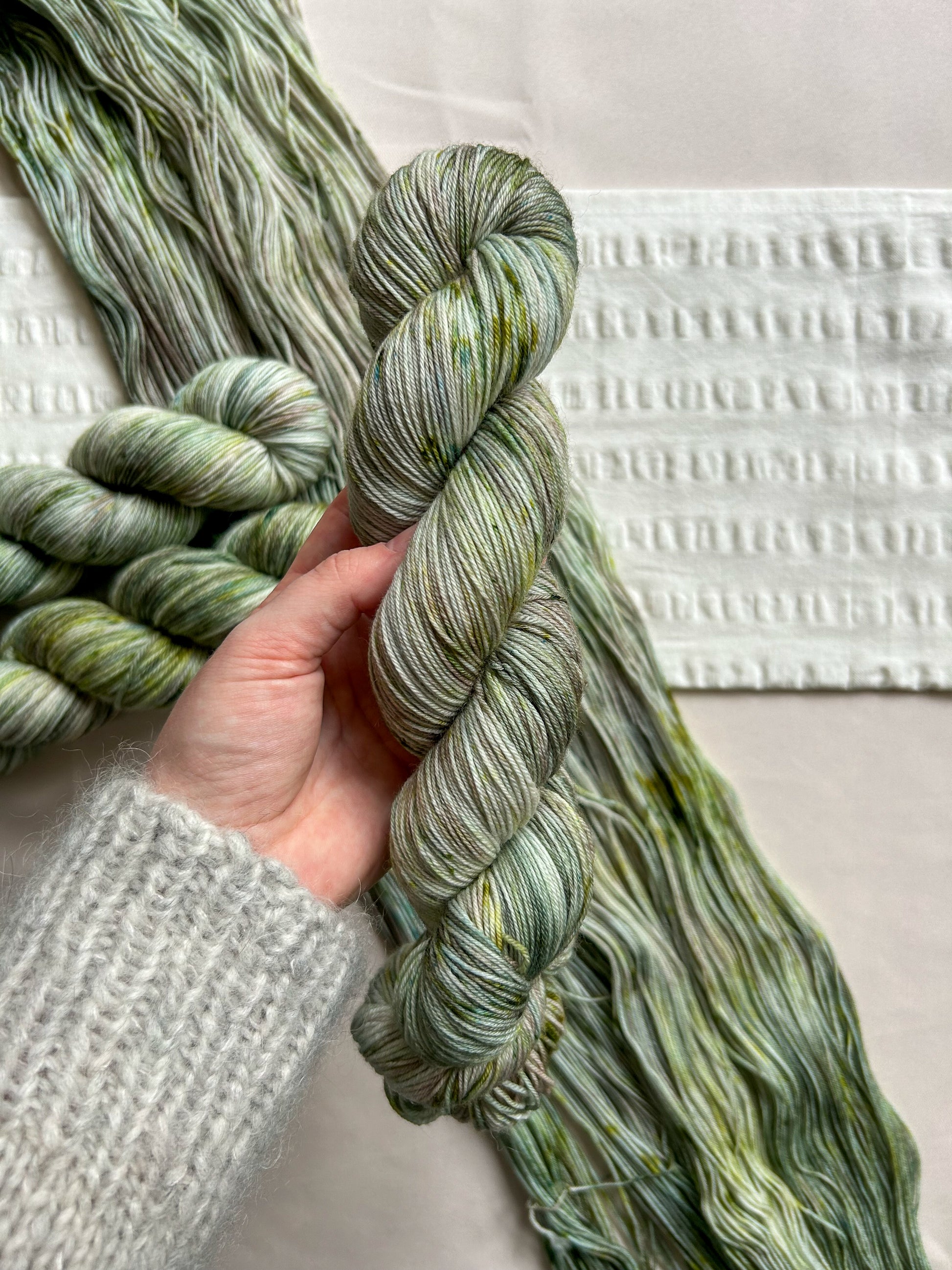 The knit and crochet swatches are worked up in the Flowy Fingering base. In the last pictures you can see the #artnouveausweater by Elenor Mortensen made by Kelly. She used Limestone in Flowy Fingering as the main color and Forest Trail on Flowy Fingering as the contrast color.