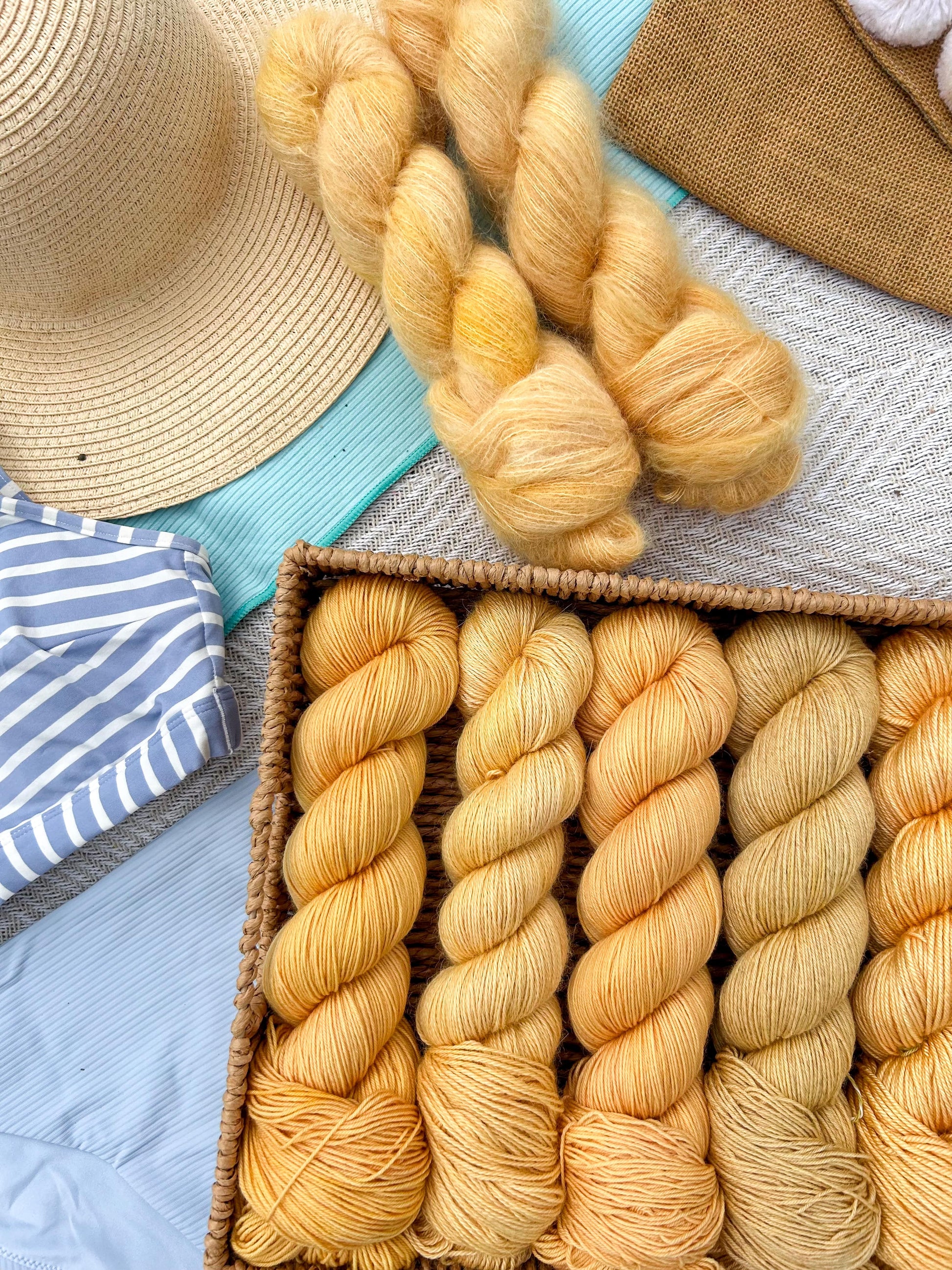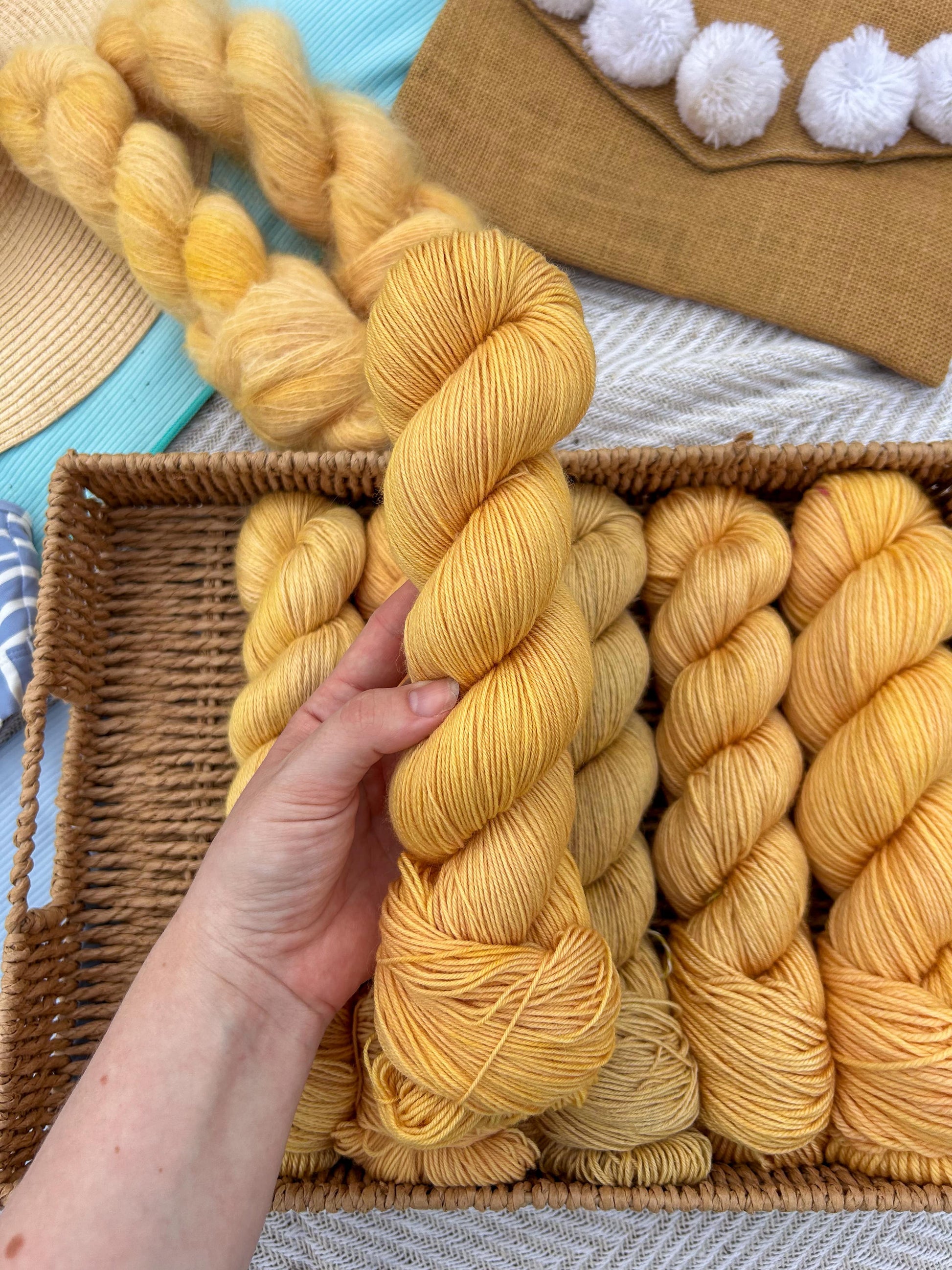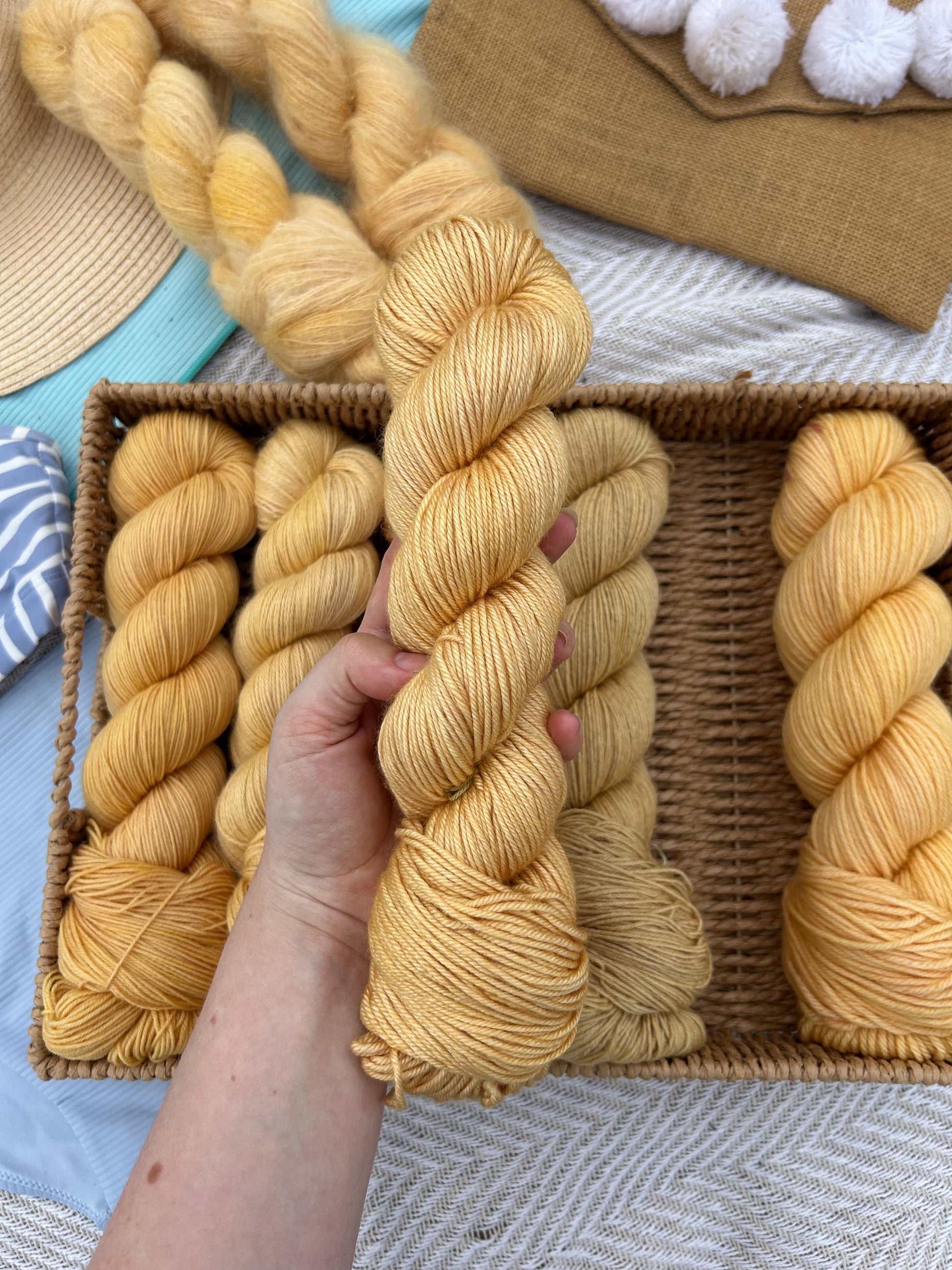Golden hour is a warm gold that shines on its own or pairs beautifully in a striped project. Itβs the color of slow days and sunset light you never want to end. It pair beautifully with Island blush and Coral reefs.Β