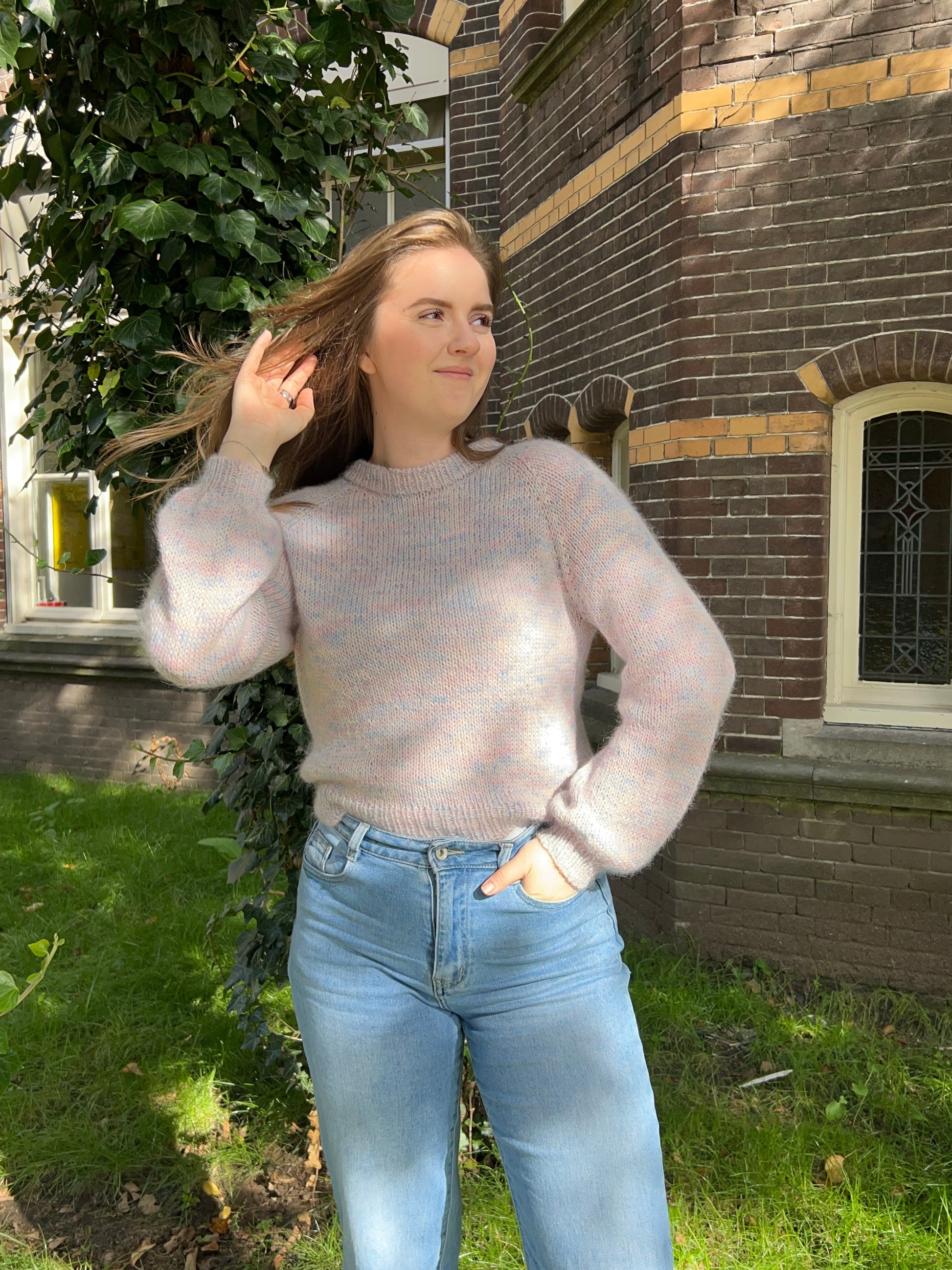In the second picture you can see a modified Lento sweater made with 'Now Varley, the bugs!' in Heavenly Alpaca held together with 'Joining of hands' in Soothing Suri. I knit a size three which uses 2 skeins of each color.